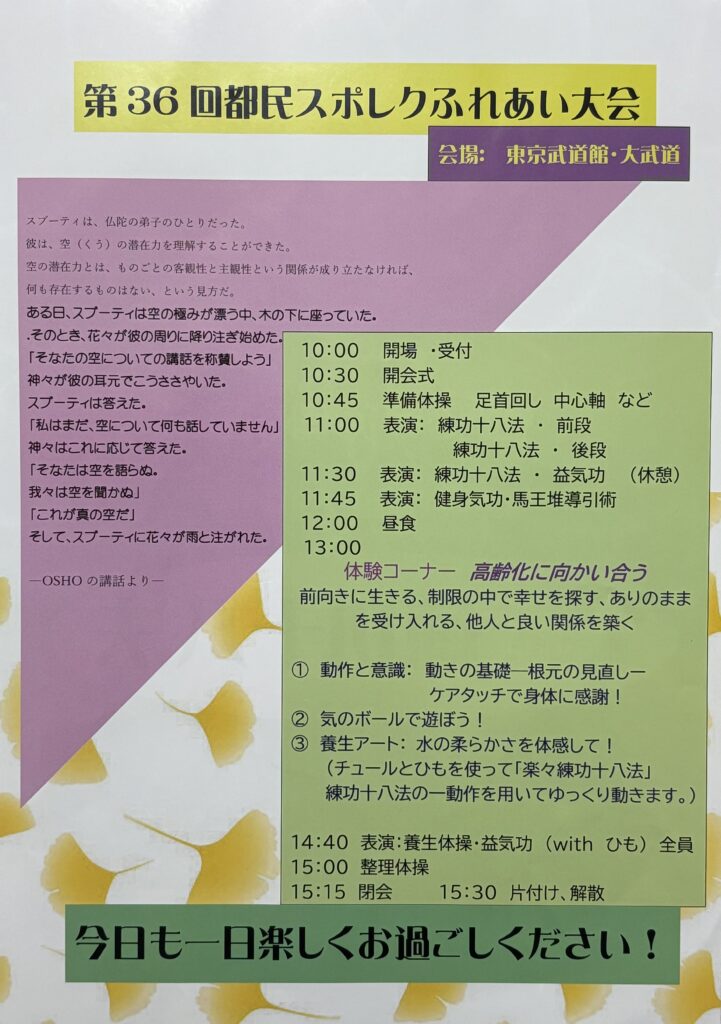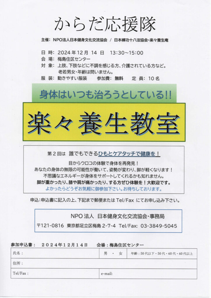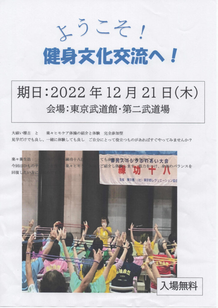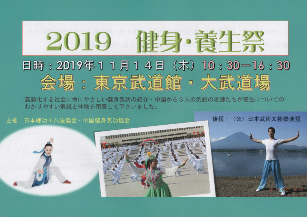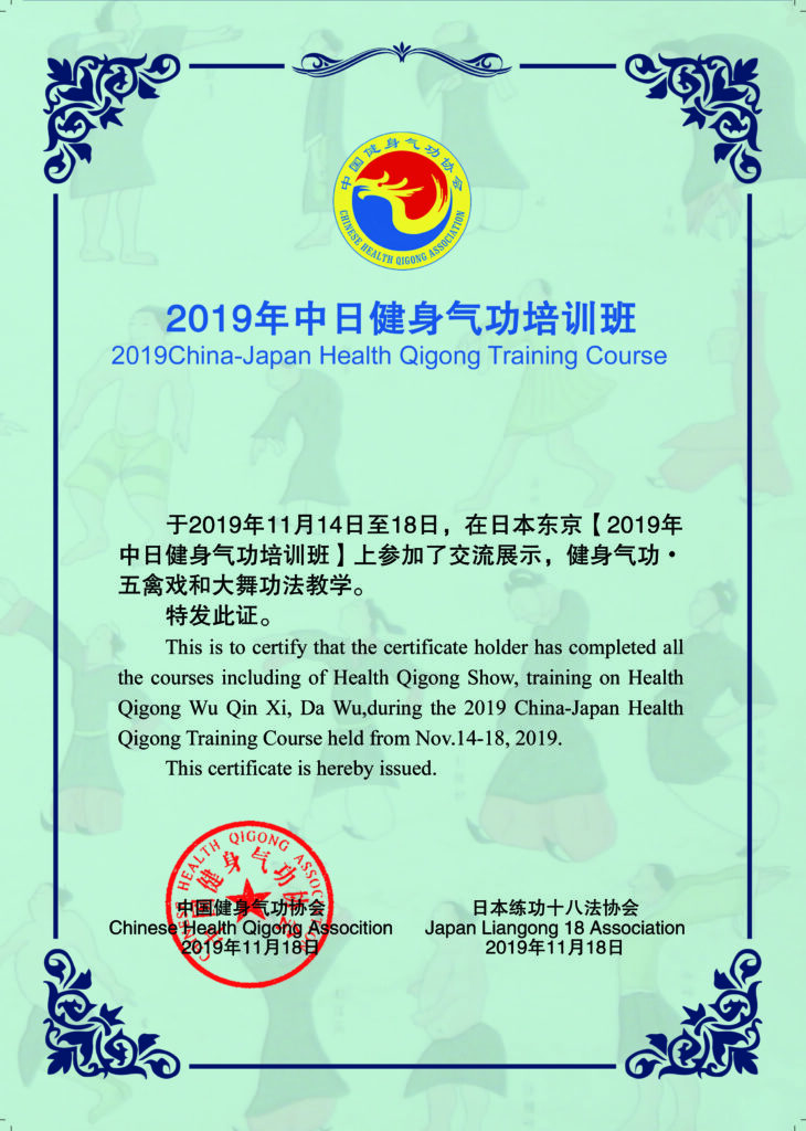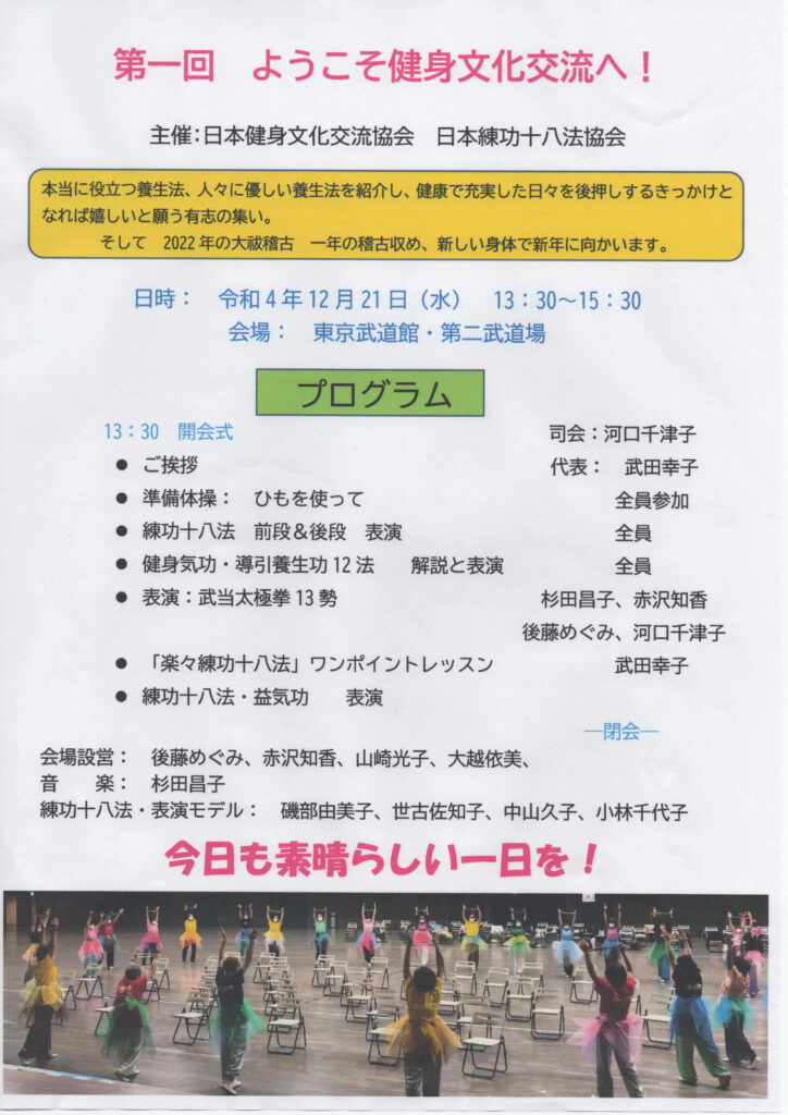 ご挨拶 1975年北京上海にて中国武術協会の親身なる太極拳の特訓をうけて感激したのが足をぬけなくなったそもそもの始まりです。訪中7回、制定拳全種、 剣、刀、伝統拳楊式、陳式等の研究を重ね、 陳家太極拳の研讃をつむかたわら汎アジア文化交流センター・太極拳交流部の副部長として中国武術、医療体育方面の日中文化交流に尽力してきました。1982年2月中国武術の名門、北京体育学院へ短期留学、その後鄭州、陳家溝へ留学しました。1980年10月、始めて上海市東路地段病院にて、練功十八法・前段を学び、翌1981年11月、2度目の訪中学習では後段を習得、その後、一貫して、ささやかながら練功十八法を日本に紹介する活動を続けてきました。 1984年8月、上海市衛生局の好意により、練功十八法の学習のため、有志7名で訪中しました。 上海市衛生局及び東昌路地段病院を始めとする関係者の皆様方のお世話によって十二分に研鑽することができました。 現在は日本練功十八法協会代表及び、 NPO法人日本健身文化交流協会代表として 活動しています。 日本練功十八法協会NPO法人日本健身文化交流協会代表 武田幸子 日本練功十八法協会 概略史 練功十八法は首、肩、腰、足の痛みを予防、治療する過程に於て創造され、発展してきたものです。漢方の医師である荘元明氏が「導引」、「五禽戯」、「八段錦」などの中国古来の養生法や武術を整理参考とし、有名な医家であり武術家であった王子平老師の「却病延年二十勢」をベースとして、多年の臨床例を通じて完成させた自己鍛練法の1つです。 二千余年の昔、すでに中国では養生法としての導引術が創られており、これが中国の医療体育の芽ばえでした。 当時「導引」とは、「筋骨を揺すり、四肢関節を動かし、気血をめぐらせる」という意味をもち、関節病を治す作用も備えていました。1973年、長沙の馬王堆三号漢墓より出土した医学書の中には二篇の導引についての専問書があり、その中の「導引図」には40余種の絵がありました。これは中国の歴史上みられる最古の導引図です。春秋時代には荘子の「刻意」の中に、又、最古の医学書「黄帝内経」の中には導引がすぐれた治療法、養生法であった記載があり、早くから古代の医家が重視していたことがうかがわれます。 漢末の名医、華は導引の理論や経験をもとにして当時盛んに行われていた六禽の戯を手直しし、「五禽の戯」をつくりました。五種の動物(虎、鹿、熊、猿、鳥)の生き生きと生きる様を動作に取入れてつくったものです。 ※唐時代には導引は広範囲に応用されるようになり、朝廷より重要な医療手段の一つとして認められていました。 随唐以後になると、導引より広まり派生した各種の健康維持の術は、更に名称も八段錦、十二段錦、易筋経、太極拳、気功などと非常に多くなりましたがこの頃になると健康法としての術は多くなりましたが、病気を治す作用そのものは次第に軽んじられてしまいました。 これらの導引、五禽の戯、八段錦などを再び整理し、マッサージの方法を加えてつくられた練功十八法は病気があれば病気を治し、病気がなければ病気を予防するという体操であり、病気を治す作用をびよみがえらせ、多くの臨床経験をもとにして治療の面、予防の面に大きな成果をあげています。 練功十八法の創始者:荘元明先生 荘元明先生と周寿祥先生 これまでのイベント 2006年 2007年 2008年 混元太極拳世界大会 2008年 蘇州市で開催された混元太極拳の世界大会 600名あまりの各国で混元太極拳を練習している方々が各分野で成果を披露した。ひょう志強老師ご夫妻が、日中太極拳交流協会の小池理事長が、中野太極拳協会の高田ご夫妻が懐かしい。 太極柔力球を習う。 2009年 練習場に行く途中寄り道。きれいな風景に記念写真。 2010年 第三回国際健身気功競技大会で審査員を務める。 2011年 2012年 2013年 2014年 2015年 武当山にて 2016年 2017年 練功十八法、健身気功、太極拳などから自分の好きな動作を選んで動く、マスクを付けていると不思議な完璧な空間が生まれ、観るもの,見られるもの双方が楽しめます。養生アートと名付け、これは近くの公園で動きました。 健身気功の日 日本側の表演 代々木公園にて「八段錦」を表演。 2018年 2018年4月5日(水)~9日(月)まで5日間、中国健身気功協会と日本練功十八協会の共催で、 東アジア健身気功指導員培訓班(トレーニングコース)を行いました。中国から気功の第一人者に来ていただき、5日間の講習会と段位審査を行いました。全国から気功の指導員があつまり、国内の指導員の交流の場にもなりました。 2018年8月4日 第三回中国国際健身気功競技大会に参加、近くの九華山で100mのお地蔵様の公園にて許可を得て、撮影させていただきました。中国人の観光客しか見当たらないなか、美術館なども併設する巨大な公園をカートで移動する。日本ならまず不可能と思える撮影許可をいただき、親切に人懐こくいいよ、いいよと言って協力してくださった皆